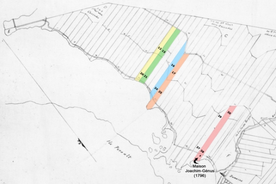 Rappelons que Joachim Génus, fils, et son frère Antoine Génus possèdent déjà un arpent et demi de ces deux terres (lots nos 37 et 38) depuis 1778, et ce, suite au décès de leur mère. Avec leur sœur, Marie-Amable, ils recevront à titre d’héritiers pour un tiers de la moitié de la succession des biens de la communauté entre Joachim Génus et feue Marie-Anne Ducharme (microfilms, m. not., Thomas Vuatier, 27 juin 1778. Partage des biens de la communauté entre Joachim Génus et feue Marie-Anne Ducharme).