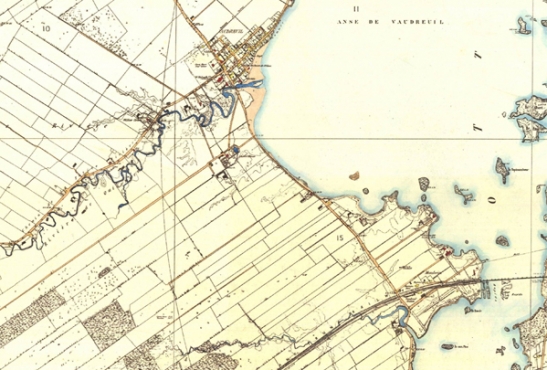 Bordé par la baie de Vaudreuil (rivière des Outaouais), ce secteur est situé au cœur de Vaudreuil-Dorion. Des censitaires s’adonnent à l’agriculture et à l’élevage dès le 18e siècle. Situées entre les villages de Vaudreuil et de Dorion, les terres accueillent, au tournant du 20e siècle, plusieurs résidences liées à la villégiature (pensions estivales, maisons de style Arts and Crafts et chalets d’été)1. Son paysage est grandement modifié avec la construction du campus de la Cité-des-Jeunes de 1963 à 19662. Le plan d’ensemble de cet immense complexe scolaire est confié à l’urbaniste Jean-Claude LaHaye (1923-1999). Des architectes réputés sont embauchés (André Marchand, Paul Goyer, Jean Ouellet, etc.) afin de concevoir les plans des nombreux édifices qui composent ce campus novateur3. Quelques années plus tard, en raison du point de vue qu’il offre sur la rivière des Outaouais et le lac des Deux Montagnes, les instances municipales y aménagent le parc de la Maison-Valois et acquièrent et restaurent, en 1972, la maison Joachim-Génus (maison Valois). Cette volonté de conserver l’accessibilité publique aux rives de la baie de Vaudreuil s’est poursuivie avec l’installation, dans le parc Paul-Gérin-Lajoie, de terrains de volleyball de plage et d’un parc de planches à roulettes (2014)4.