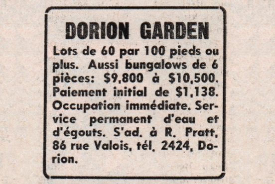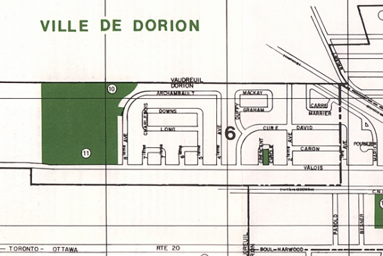 Ce secteur de Dorion voit le jour entre 1956-1958 avec l’implantation d’un vaste projet domiciliaire novateur, le Dorion Garden. À l’origine, cette vaste bande de terre en pointe, située entre les voies ferrées du Canadien National et celles du Canadien Pacifique, faisait partie du territoire de la Municipalité de paroisse de Vaudreuil1. Ce secteur comprenait principalement des champs et des propriétés agricoles dont l’accès principal était la rue Valois. Cette dernière portera plusieurs noms dont la montée des Français et la montée des Renards2. Annexée en 1949 à la Ville de Dorion contre une compensation de 6 000 $3, ce territoire connaît une transformation majeure sous la vision des entrepreneurs Roméo Pratt et François-Xavier Brock Fuger (Pratt & Fuger) qui y développent un quartier résidentiel de plus de 1 200 maisons4. Inspiré du concept anglais de la cité-jardin, le Dorion Garden se démarque à l’époque par ses rues incurvées bordées d’arbres qui assurent à ses résidents une tranquillité et une belle qualité de vie5.